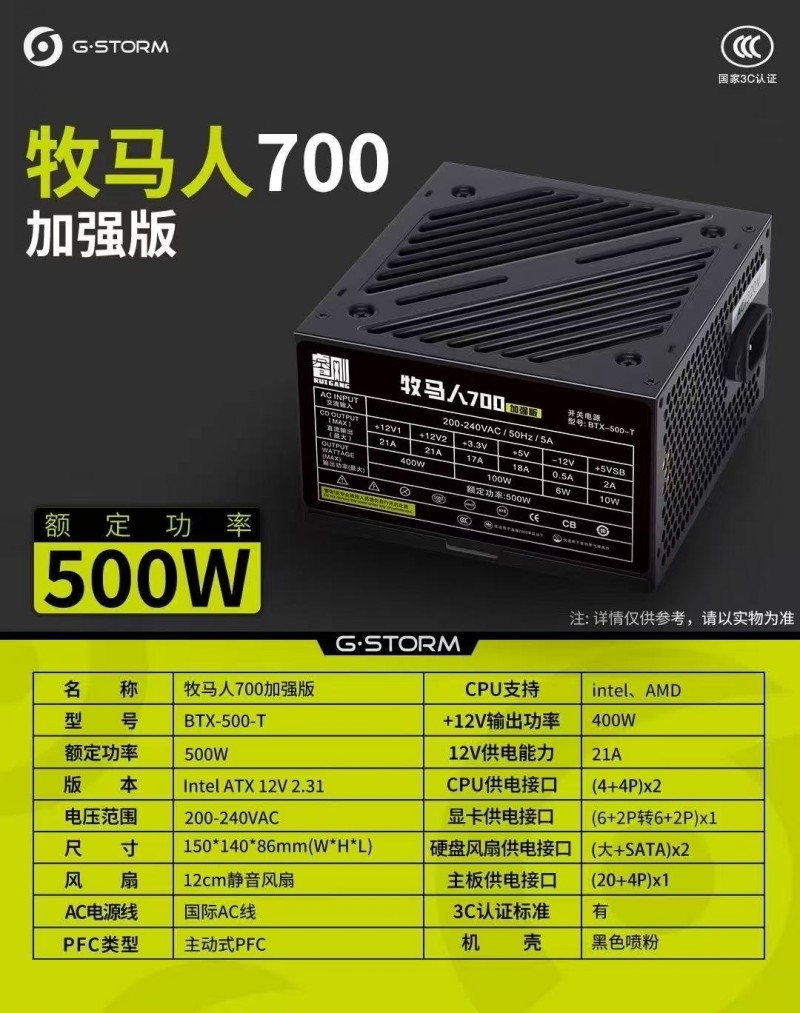 商品名称:游戏风暴 牧马人700 额定500W电脑电源台式机主机电源 商品编号:ECS017266 品牌:游戏风暴 上架时间:2023-06-05 商品毛重:0克