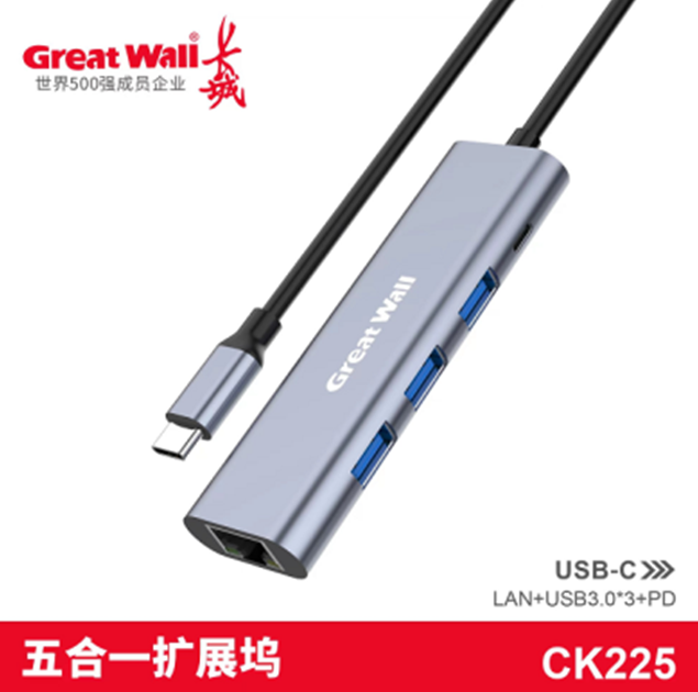 商品名称:长城CK225 5合1扩展坞 RJ45千兆+USB3.0*3+PD 商品编号:ECS020220 品牌:长城 上架时间:2025-10-07 商品毛重:0克 5合1扩展坞: RJ45千兆+USB3.0*3+PD
