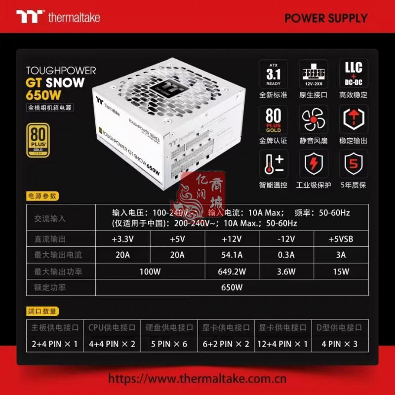商品名称:Thermaltake(Tt) GT650W白色 金牌 650W机箱电源 商品编号:ECS020237 品牌:Thermaltake(Tt) 上架时间:2025-10-11 商品毛重:0克