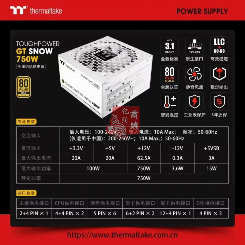商品名称:Thermaltake(Tt) GT750W白色 金牌 750W机箱电源 商品编号:ECS020239 品牌:Thermaltake(Tt) 上架时间:2025-10-11 商品毛重:0克