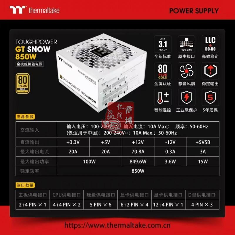 商品名称:Thermaltake(Tt) GT850W白色 金牌 850W机箱电源 商品编号:ECS020241 品牌:Thermaltake(Tt) 上架时间:2025-10-11 商品毛重:0克