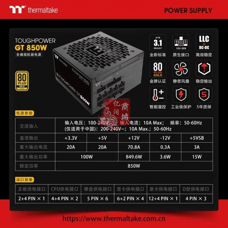 商品名称:Thermaltake(Tt) GT850W黑色 金牌 850W机箱电源 商品编号:ECS020242 品牌:Thermaltake(Tt) 上架时间:2025-10-11 商品毛重:0克