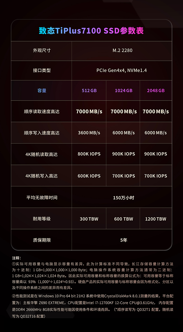 商品名称:致态TiPLUS7100 2T PCIE4.0 NVME M.2固态硬盘(盒包) 商品编号:ECS020280 品牌:WD/西部数据 上架时间:2025-10-22 商品毛重:0克