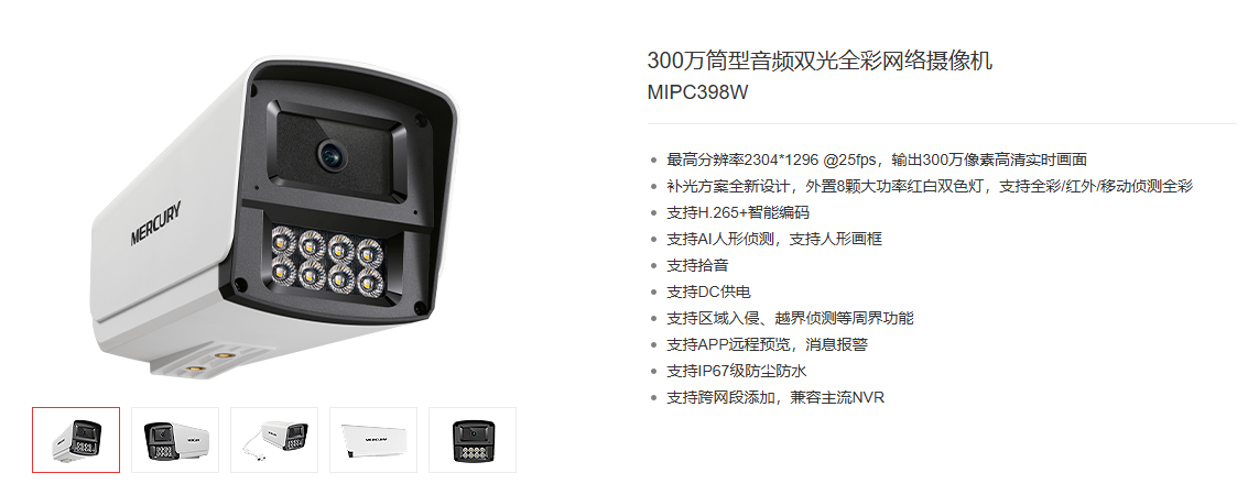 商品名称:水星 MIPC398W 400mm 300万双光全彩音频摄像机 商品编号:ECS020405 品牌:水星 上架时间:2025-12-04 商品毛重:0克