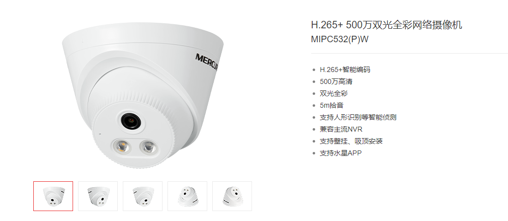 商品名称:水星 MIPC532W 4mm 500万双光全彩音频半球摄像机 商品编号:ECS020407 品牌:水星 上架时间:2025-12-04 商品毛重:0克