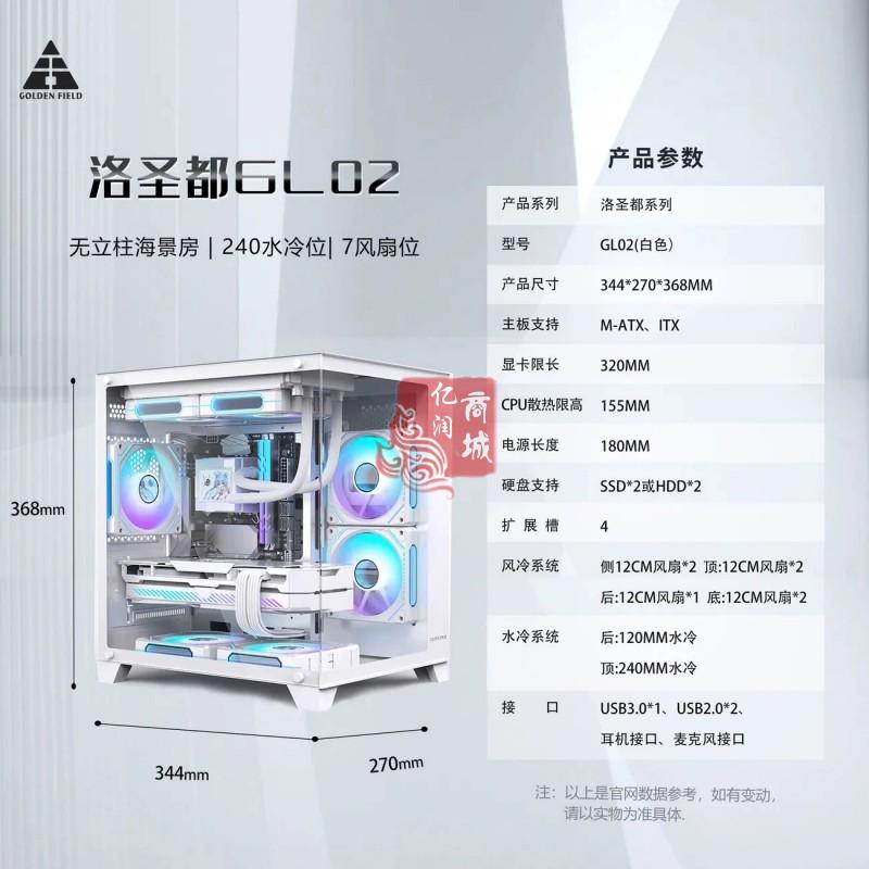 商品名称:金河田GL02 白色 无立柱全景玻璃全侧透240水冷海景房机箱 商品编号:ECS020442 品牌:金河田 上架时间:2025-12-10 商品毛重:0克