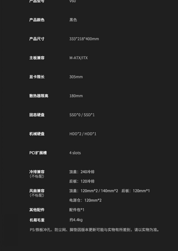 商品名称:爱国者V60 黑色 海景房机箱MATX紧凑型240水冷无立柱机箱 商品编号:ECS020448 品牌:爱国者 上架时间:2025-12-15 商品毛重:0克