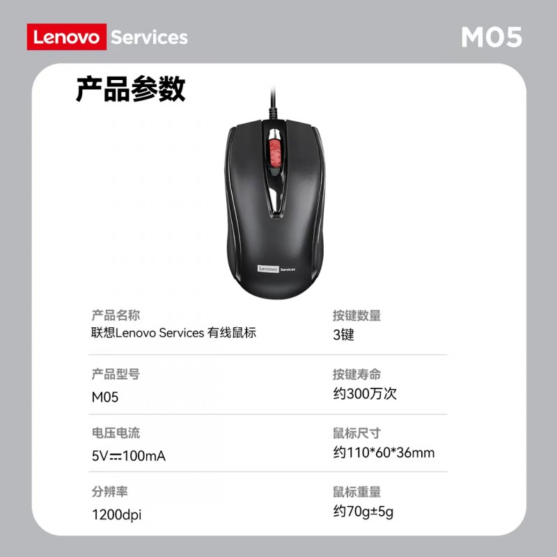 商品名称:联想Services M05 有线办公鼠标 商品编号:ECS020491 品牌:联想 上架时间:2026-01-13 商品毛重:0克