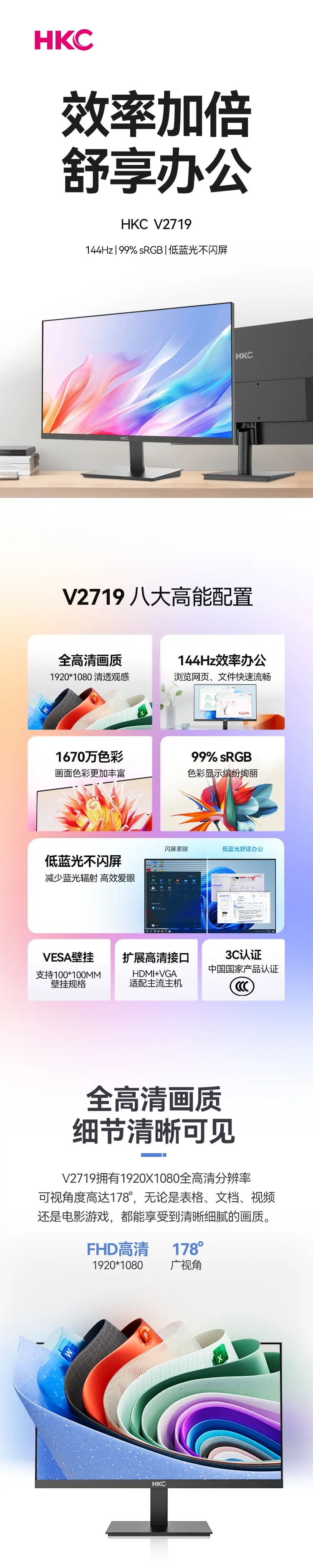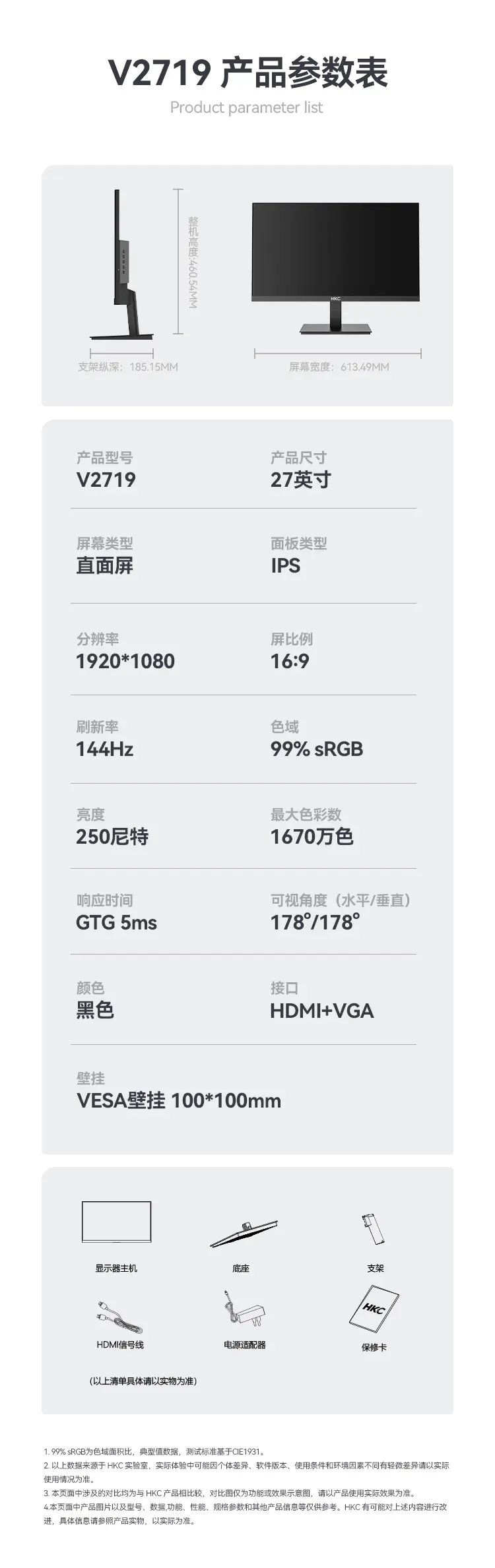 商品名称:HKC V2719 27寸IPS 144HZ 商务办公显示器 商品编号:ECS020564 品牌:HKC/惠科 上架时间:2026-01-30 商品毛重:0克