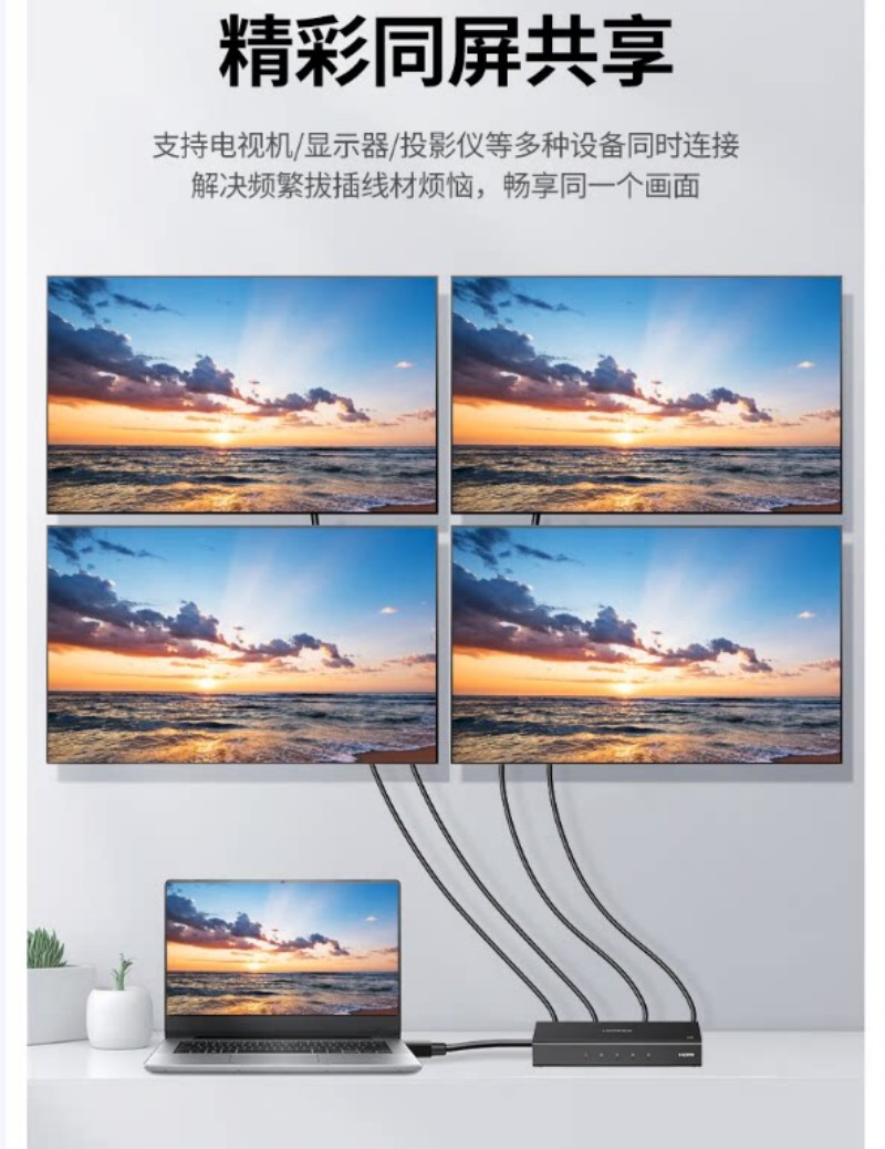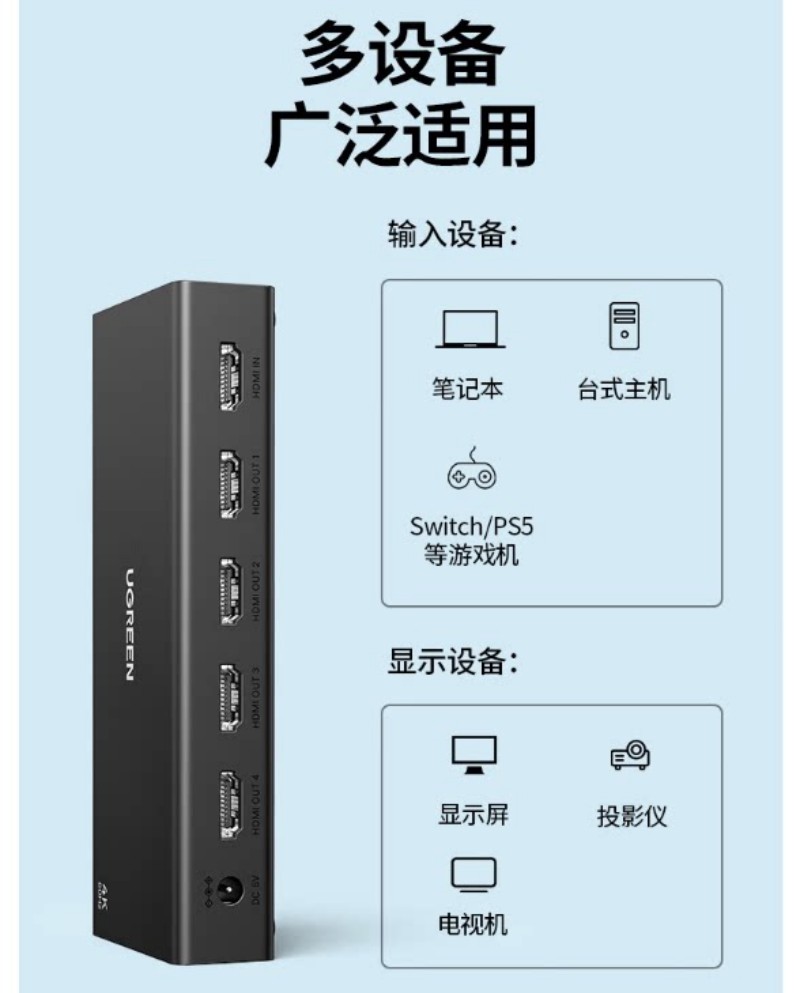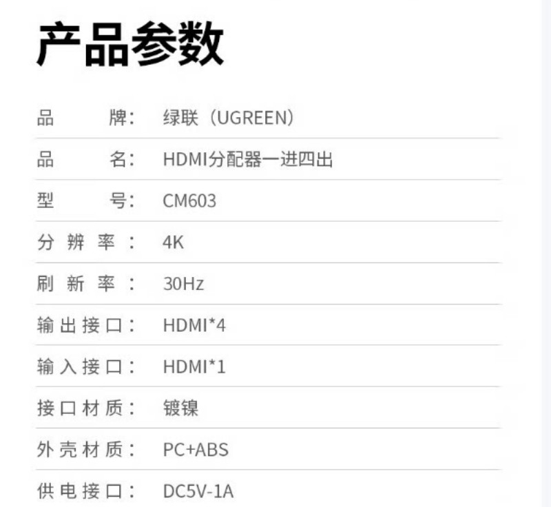 商品名称:绿联90805 HDMI分配器4K 一分四分屏器1进4出一拖四 商品编号:ECS020595 品牌:绿联 上架时间:2026-02-25 商品毛重:0克