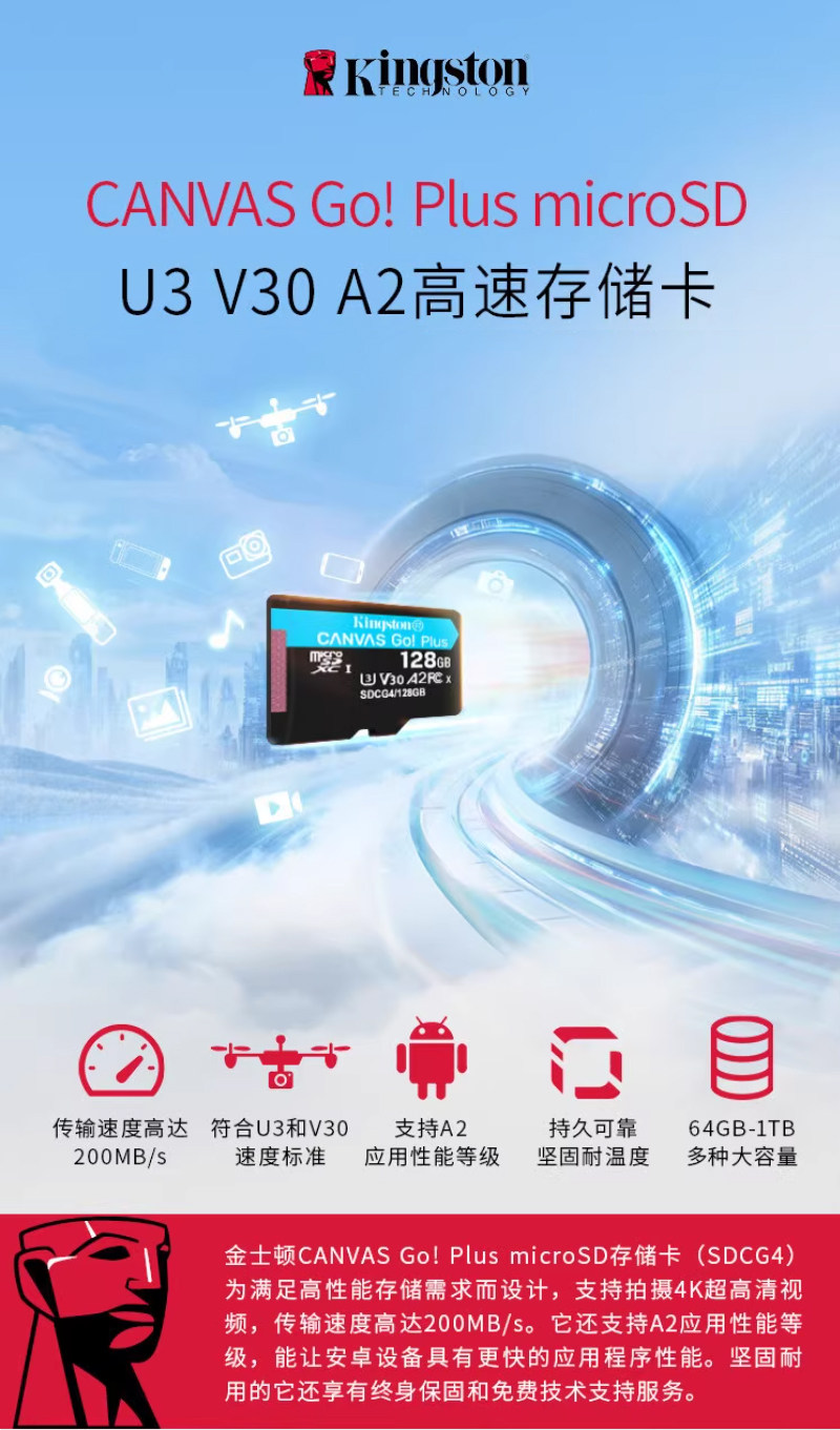 商品名称:金士顿 SDCG4 256G(200M/160M) U3 V30 4K TF卡内存卡 商品编号:ECS020603 品牌:金士顿 上架时间:2026-02-25 商品毛重:0克