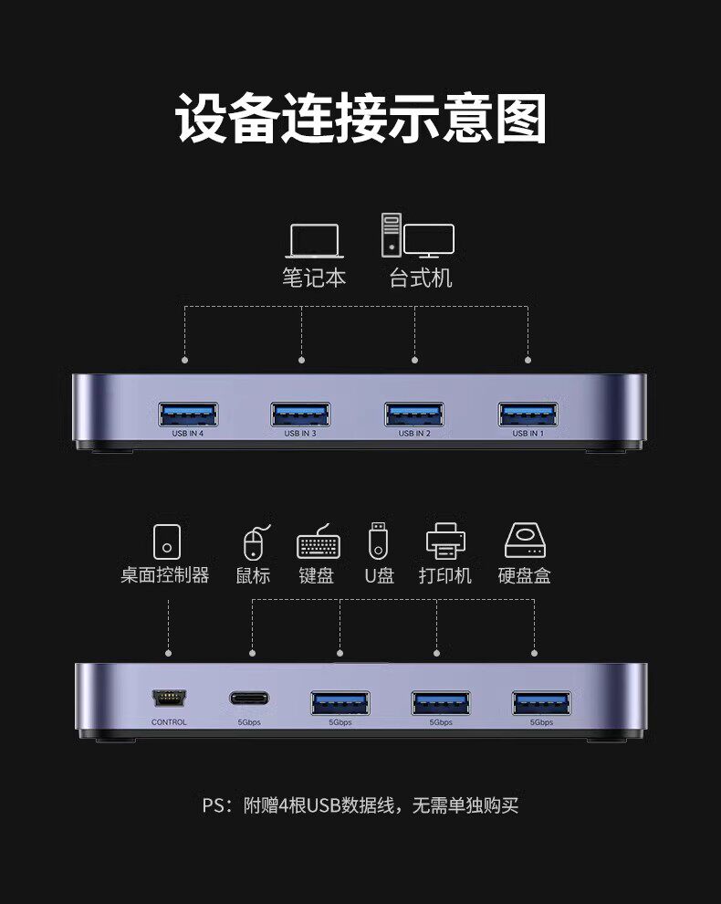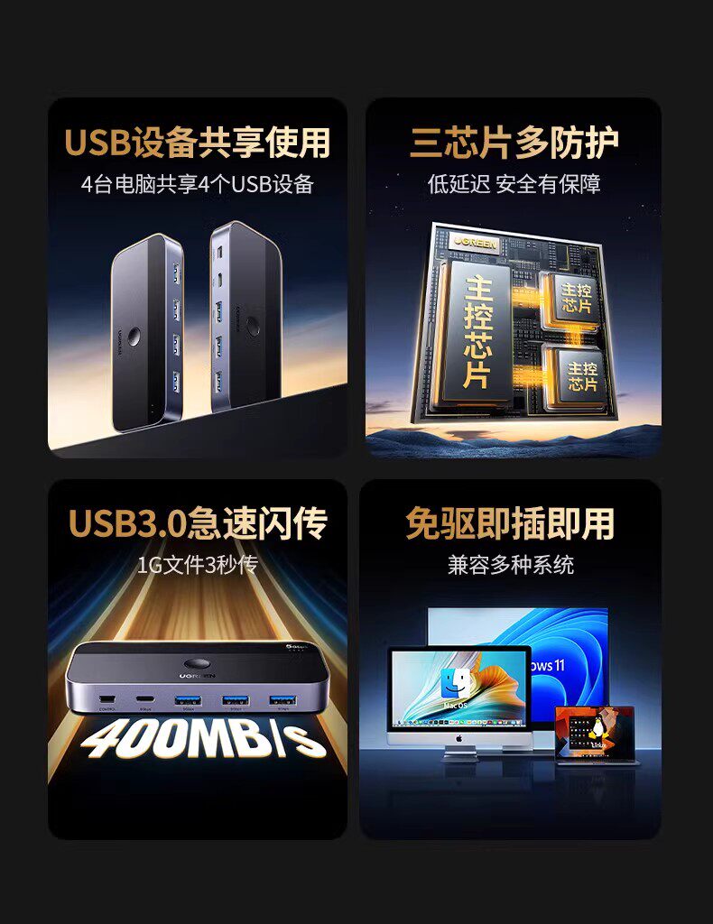 商品名称:绿联 35764 USB3.0共享切换器 四进四出 商品编号:ECS020702 品牌:绿联 上架时间:2026-03-19 商品毛重:0克