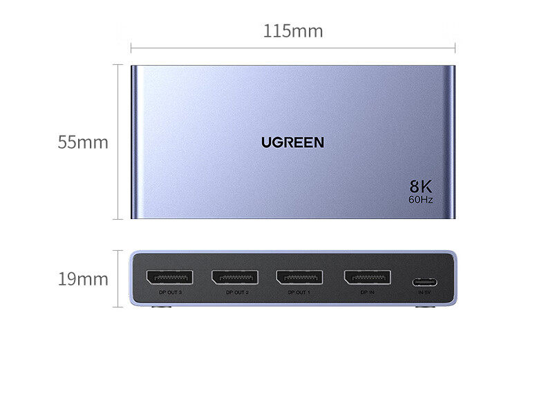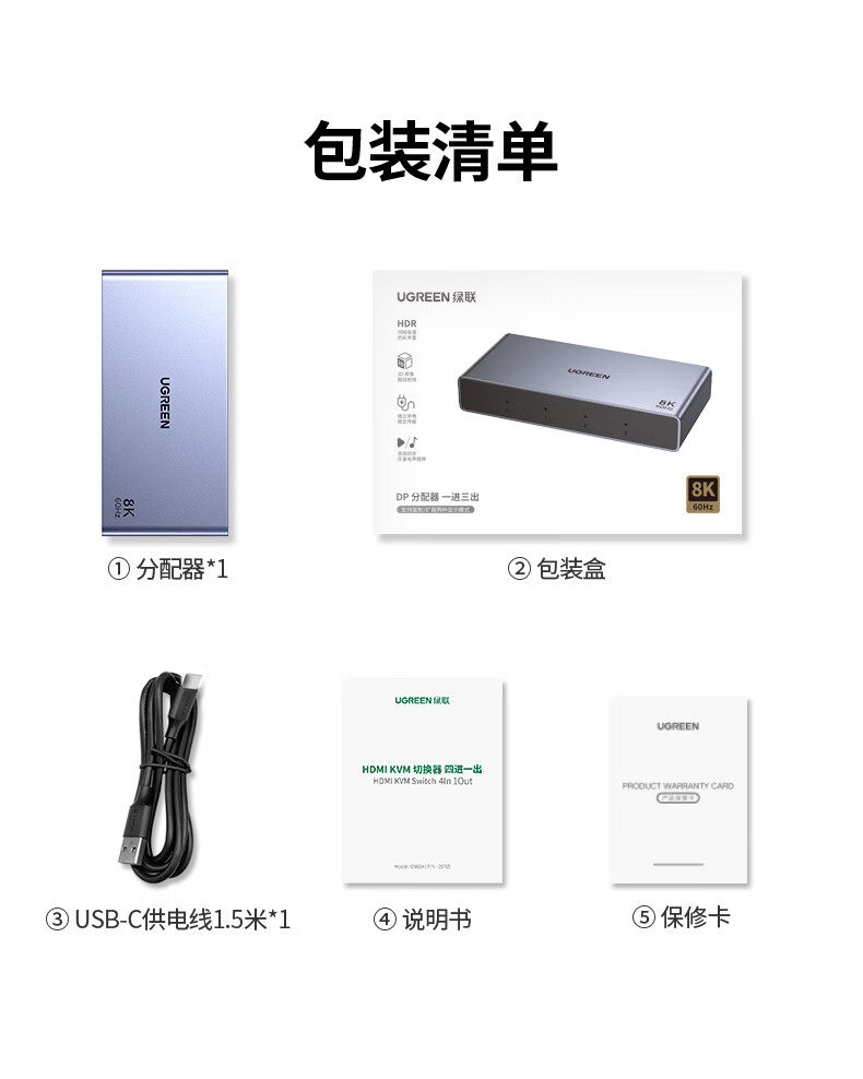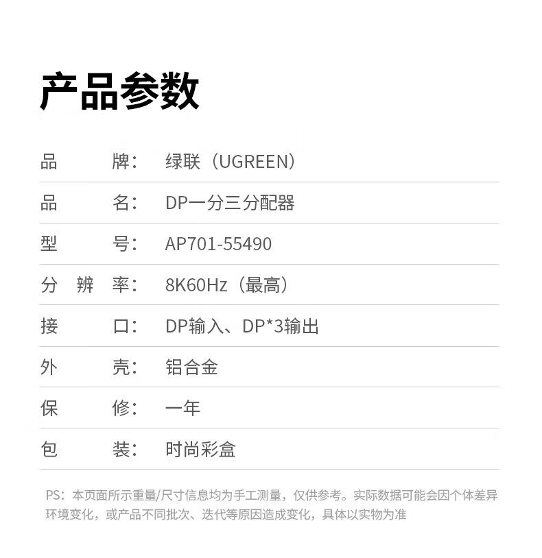商品名称:绿联55348 DP1.4分配器一进三8K 带供电 商品编号:ECS020714 品牌:绿联 上架时间:2026-03-19 商品毛重:0克
