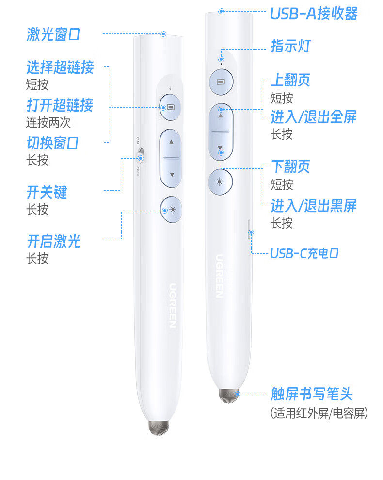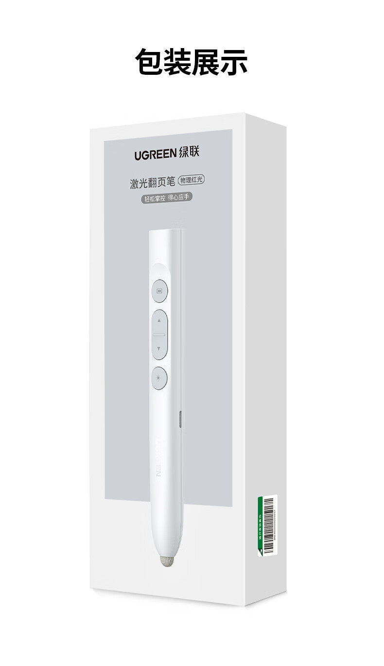 商品名称:绿联45117 可书写/触控红光翻页笔 充电款 PPT激光笔 商品编号:ECS020719 品牌:绿联 上架时间:2026-03-20 商品毛重:0克