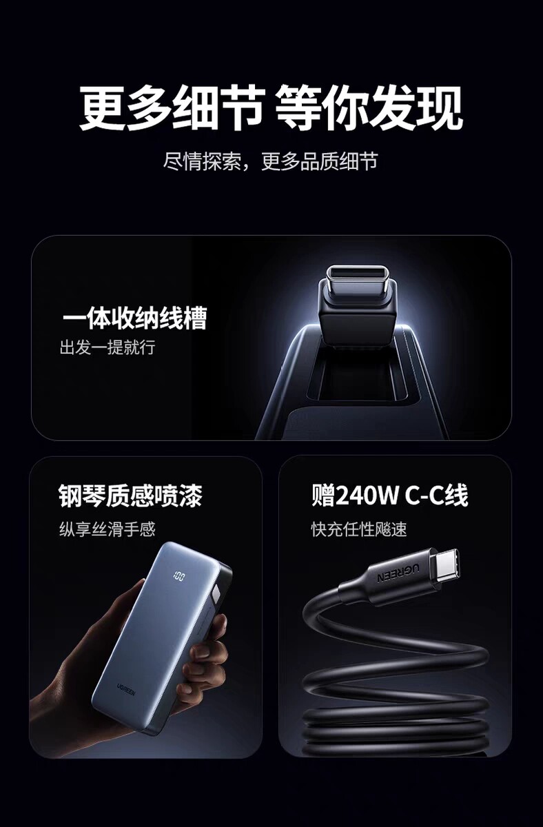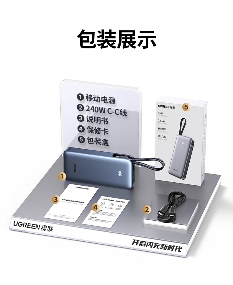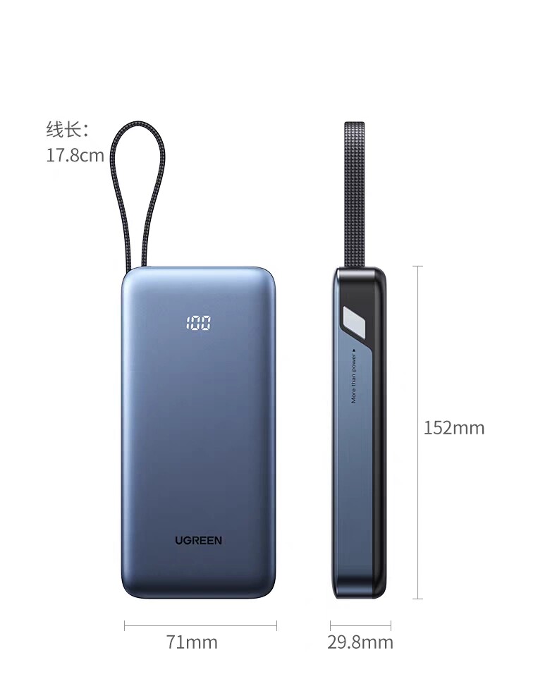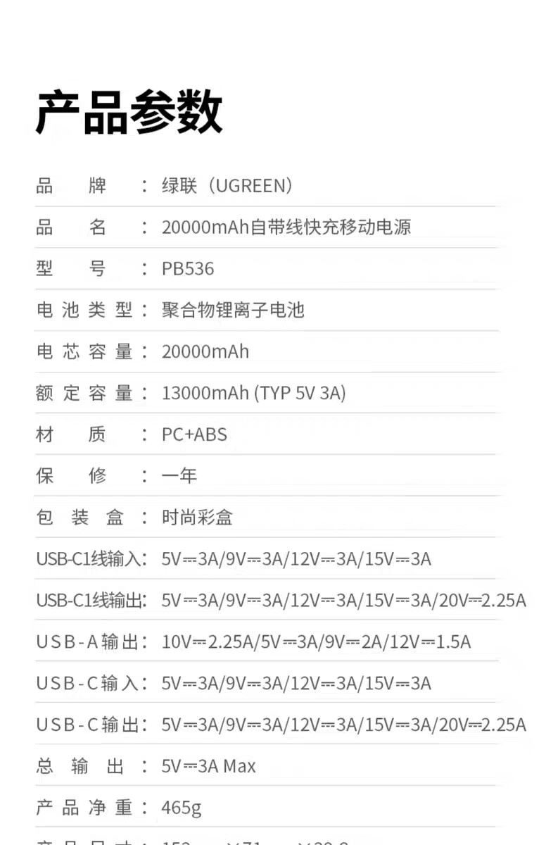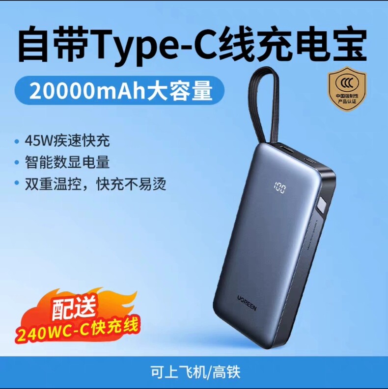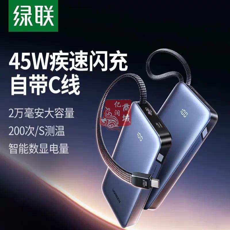 商品名称:绿联55988 20000毫安移动电源45W快充自带线充电宝 商品编号:ECS020728 品牌:绿联 上架时间:2026-03-20 商品毛重:0克