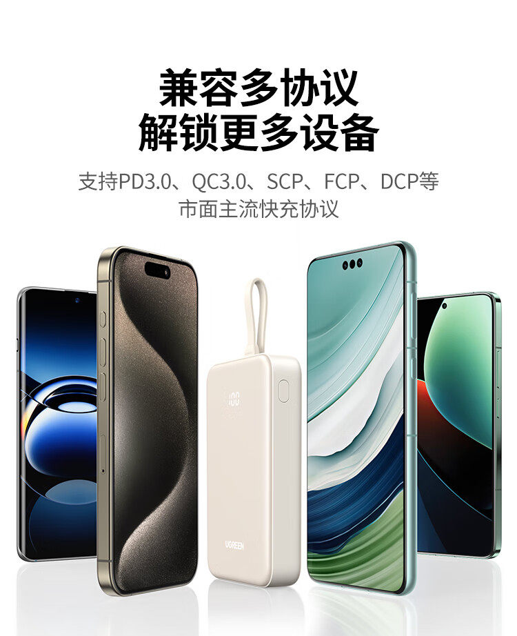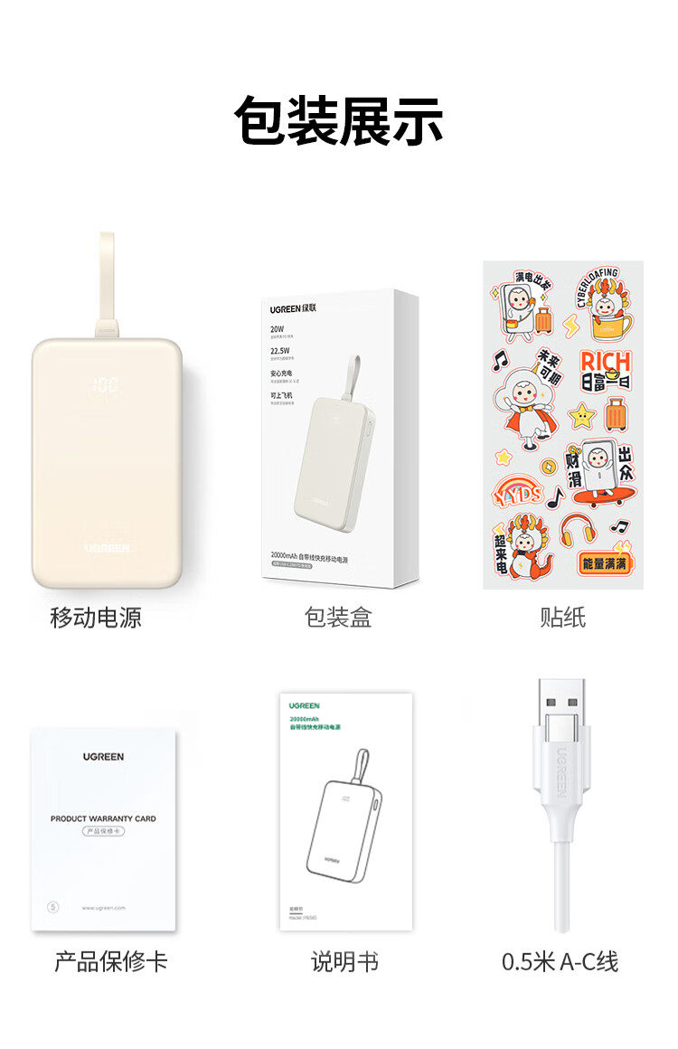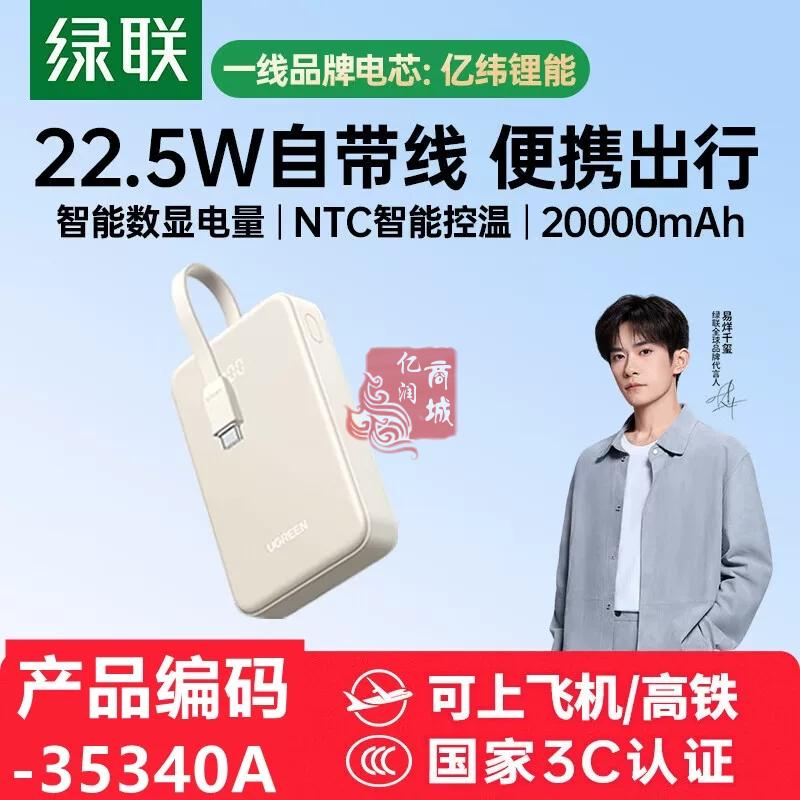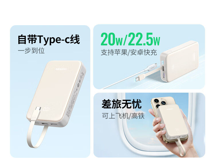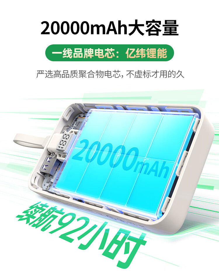 商品名称:绿联35340A-20000mAh移动电源带c线奶白色/自带线 商品编号:ECS020729 品牌:绿联 上架时间:2026-03-20 商品毛重:0克