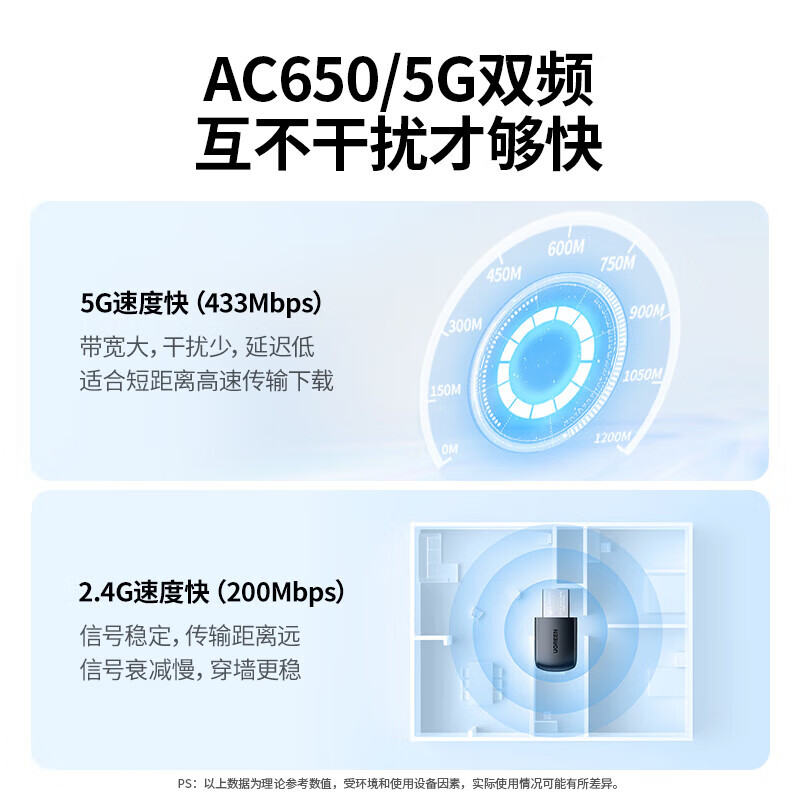 商品名称:绿联 20204 USB无线网卡免驱AC650M双频-WiFi5 商品编号:ECS020754 品牌:绿联 上架时间:2026-03-23 商品毛重:0克