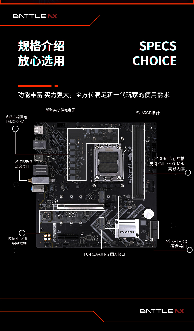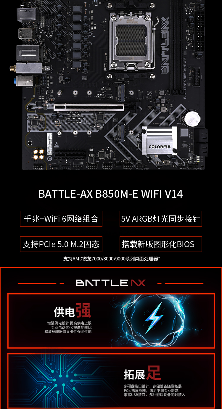商品名称:七彩虹 BATTLE-AX B850M-E WIFI V14 主板 商品编号:ECS020767 品牌:七彩虹 上架时间:2026-03-23 商品毛重:0克