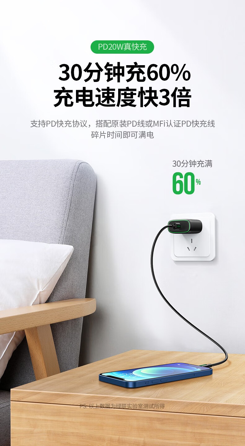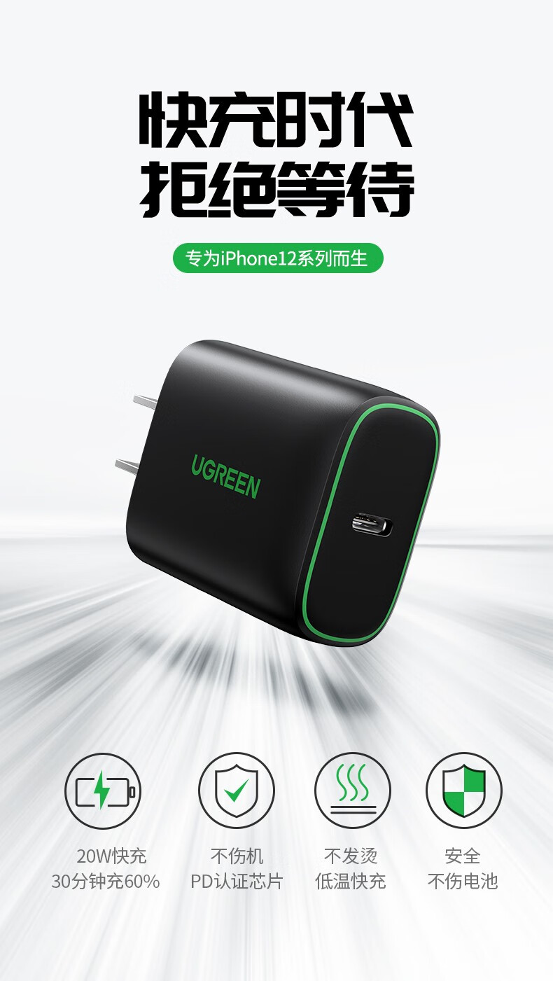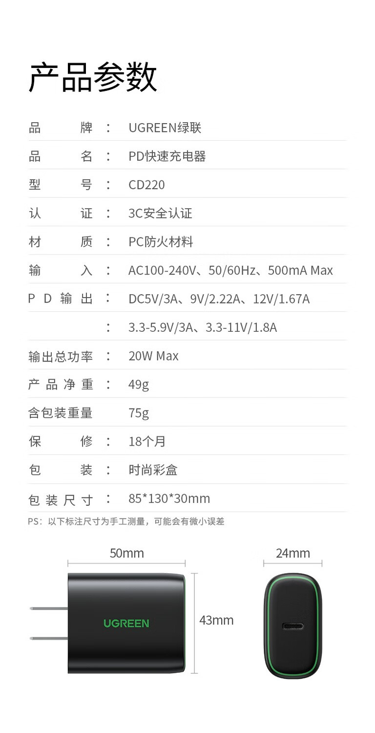 商品名称:绿联80575 USB-C pd快充充电器20W快充头 商品编号:ECS020777 品牌:绿联 上架时间:2026-03-24 商品毛重:0克