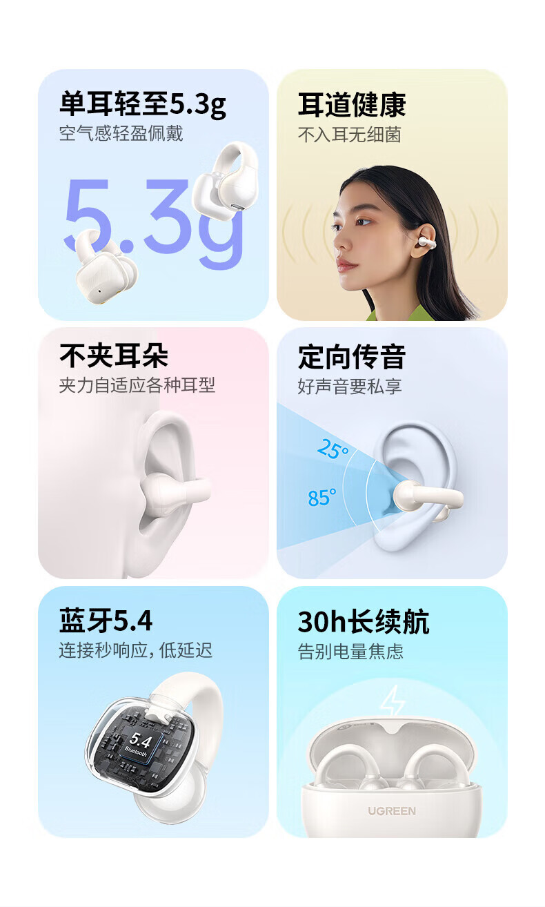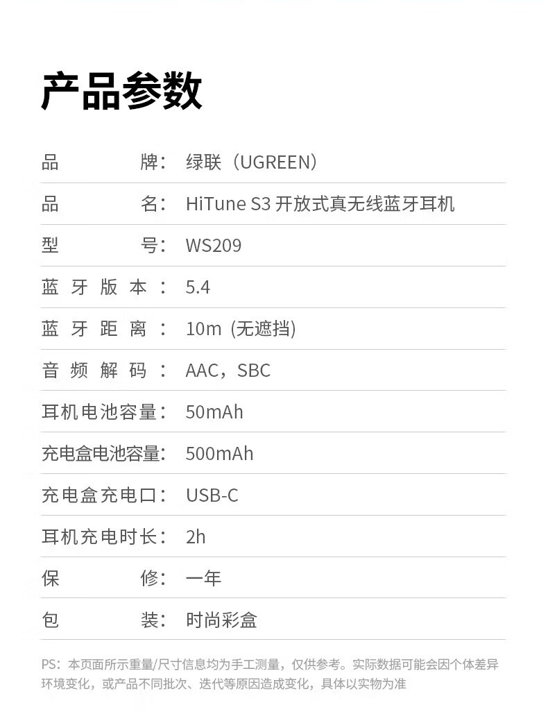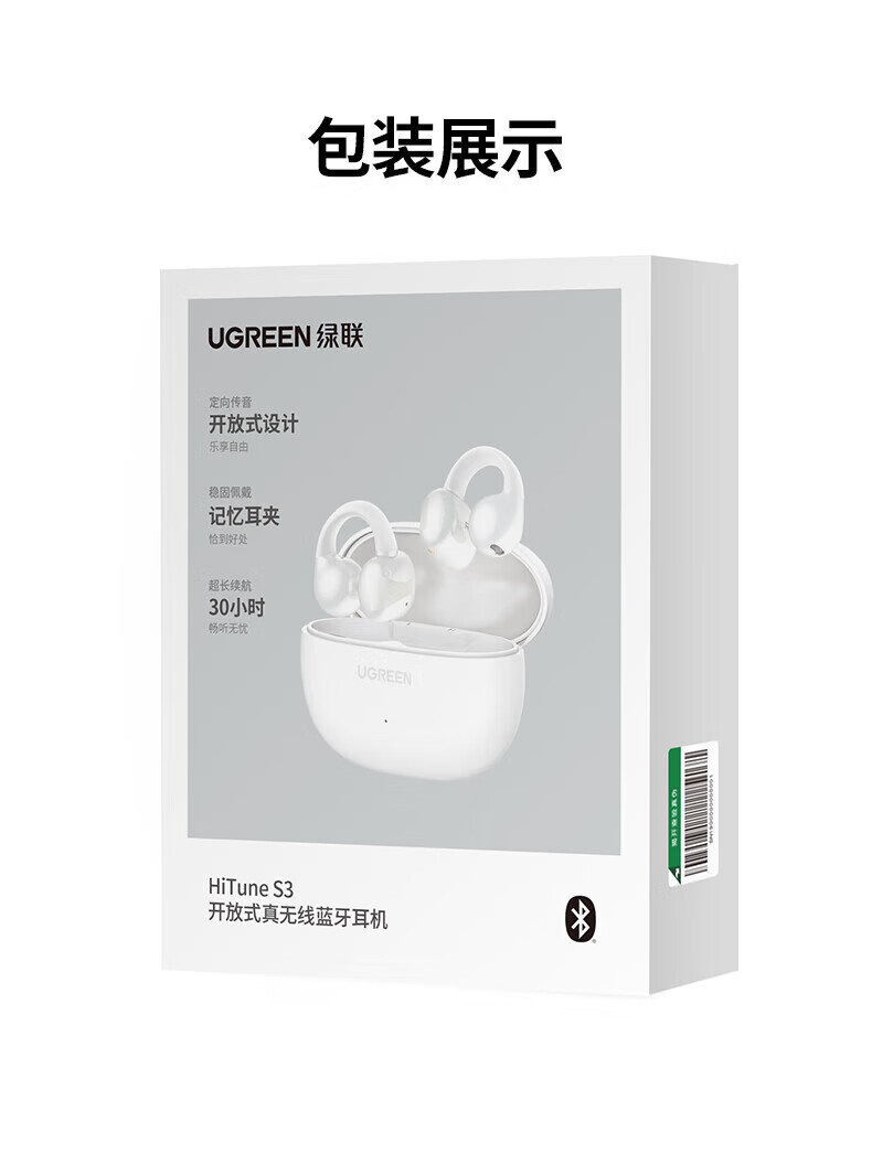 商品名称:绿联45785 HiTune S3真无线蓝牙耳机气传导耳夹式 商品编号:ECS020799 品牌:绿联 上架时间:2026-03-25 商品毛重:0克