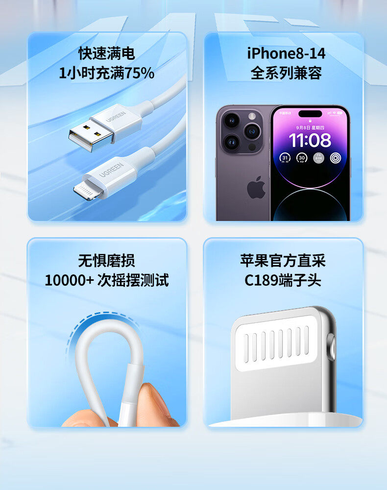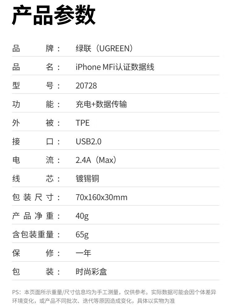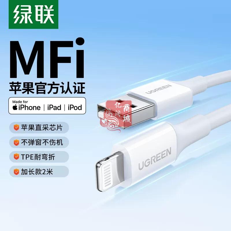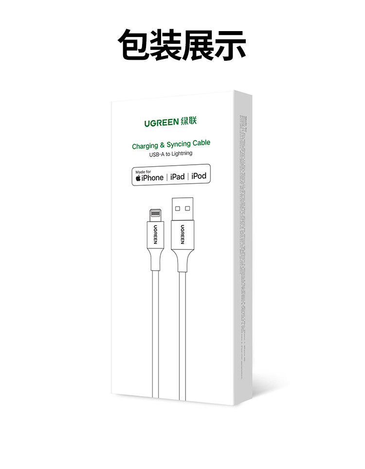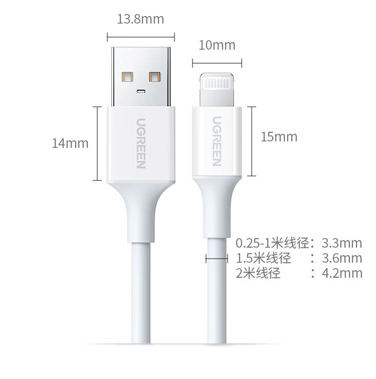 商品名称:绿联20730 USB2.0 A公转lightning快充线充电器线2米白色 商品编号:ECS020816 品牌:绿联 上架时间:2026-03-25 商品毛重:0克