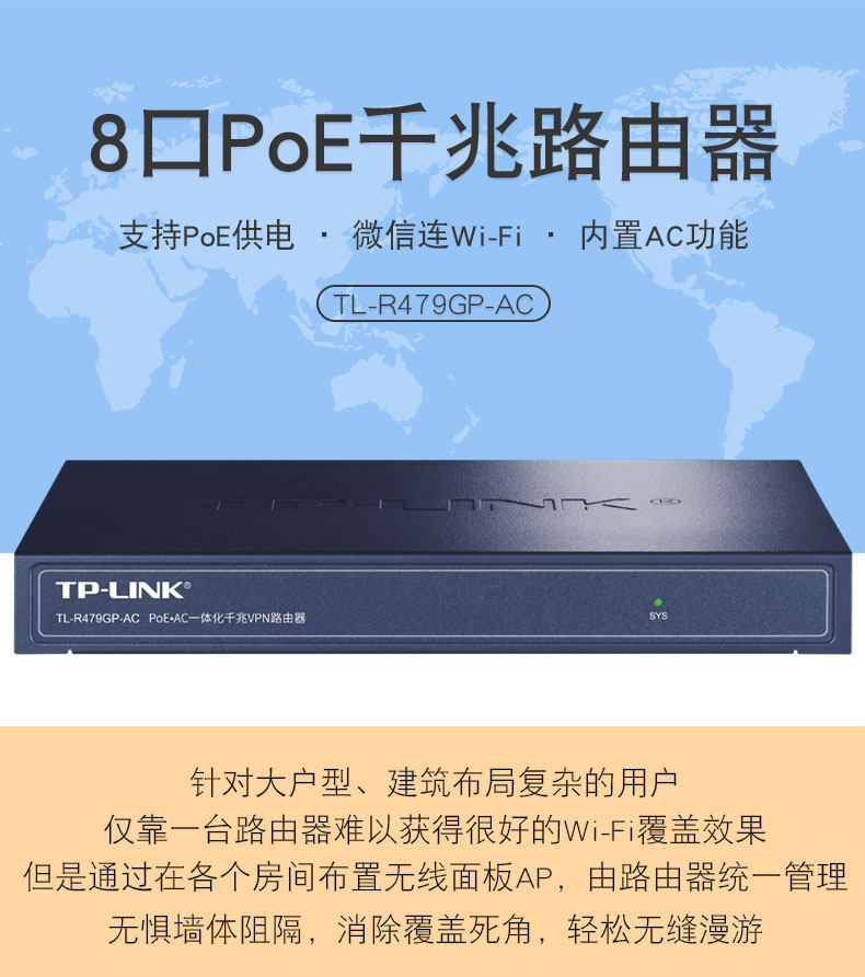 商品名称:TP-LINK TL-R479GP-AC 8口标准POE千兆路由器商用 商品编号:ECS020866 品牌:TP-LINK 上架时间:2026-03-26 商品毛重:0克