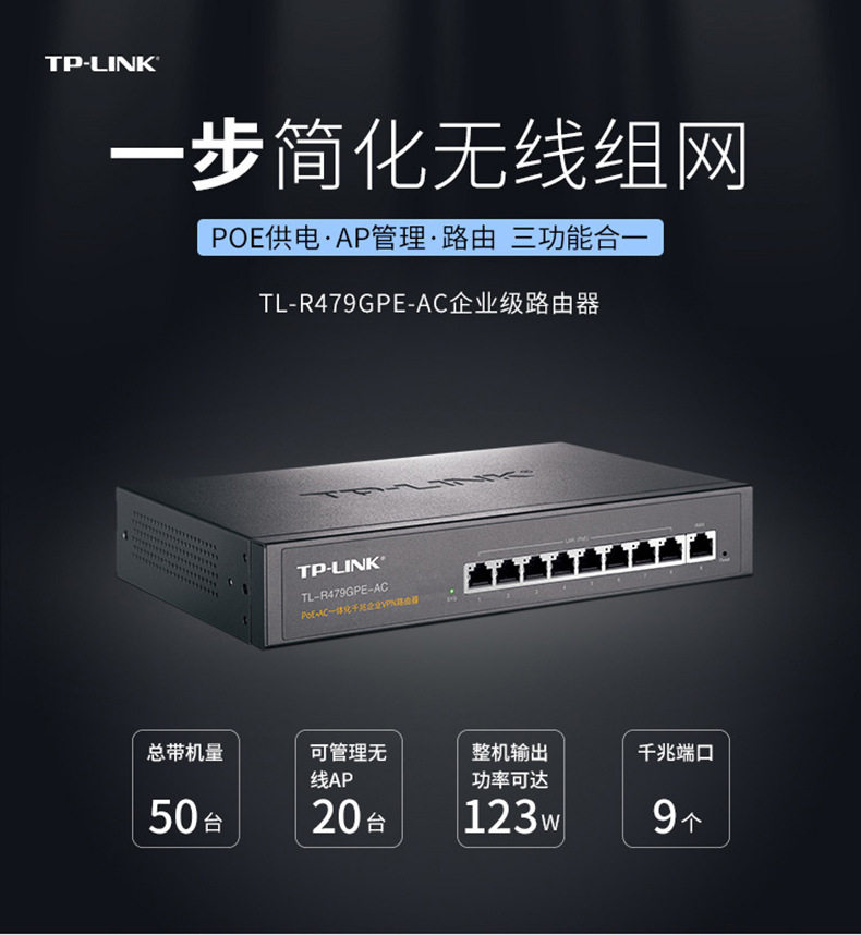 商品名称:TP-LINK TL-R479GPE-AC 9口全千兆POE一体化路由器 商品编号:ECS020867 品牌:TP-LINK 上架时间:2026-03-26 商品毛重:0克