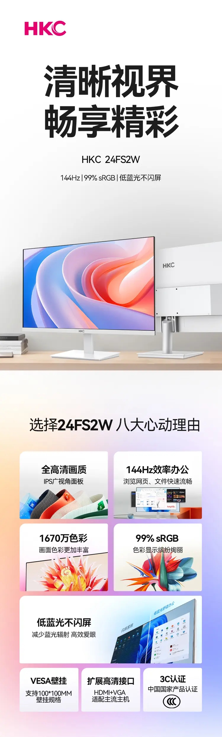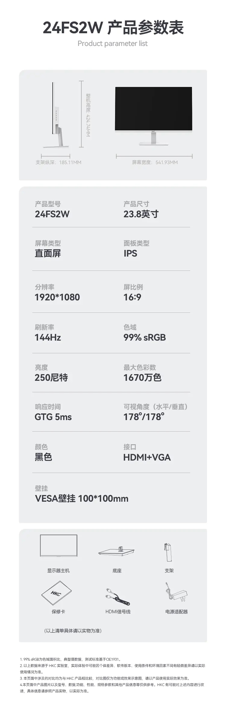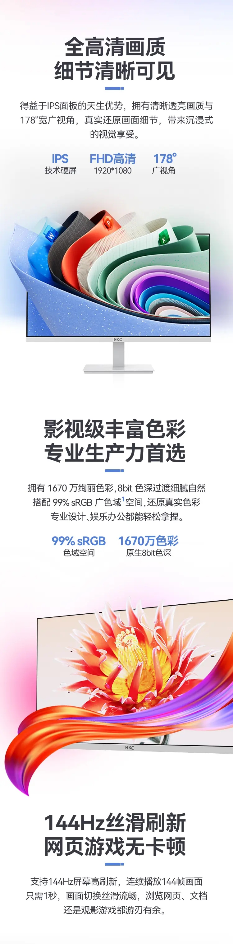 商品名称:HKC 24FS2W白色 144HZ 23.8英寸商务办公显示器 商品编号:ECS020885 品牌:HKC/惠科 上架时间:2026-03-27 商品毛重:0克