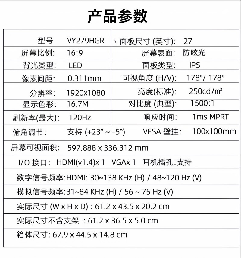 商品名称:华硕VY279HGR IPS显示器27英寸120Hz防蓝光办公游戏显示器屏 商品编号:ECS020894 品牌:ASUS/华硕 上架时间:2026-03-27 商品毛重:0克