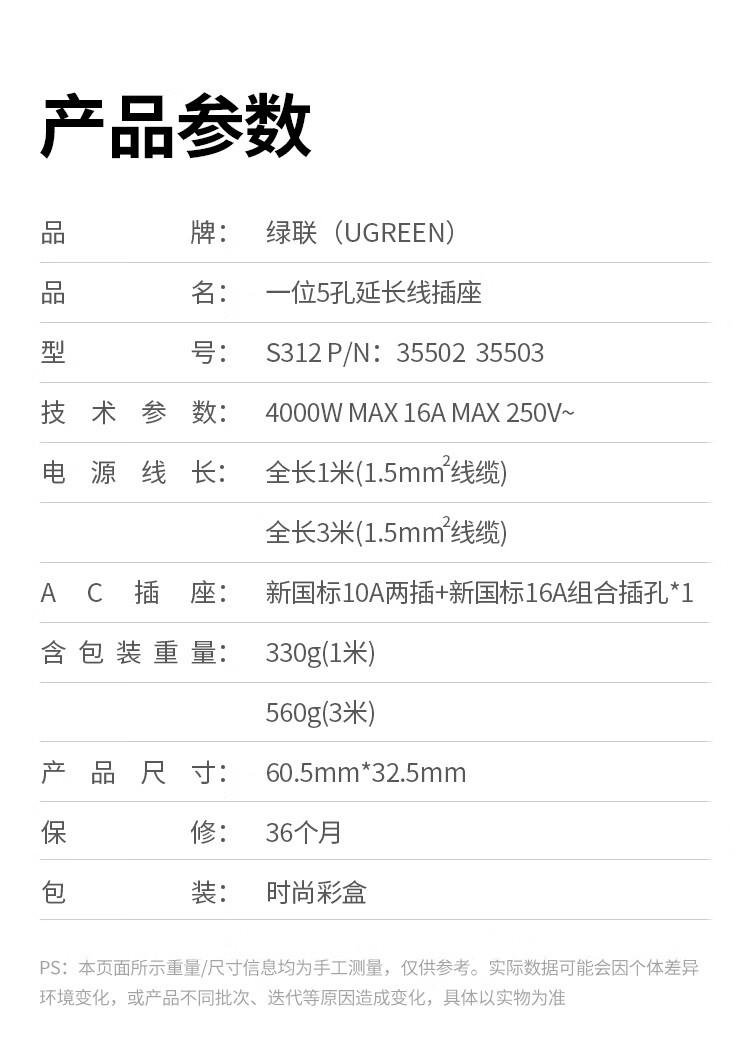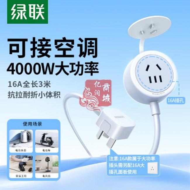 商品名称:绿联35503 一位AC 16A组合孔 延长线插座3米 商品编号:ECS020929 品牌:绿联 上架时间:2026-03-27 商品毛重:0克