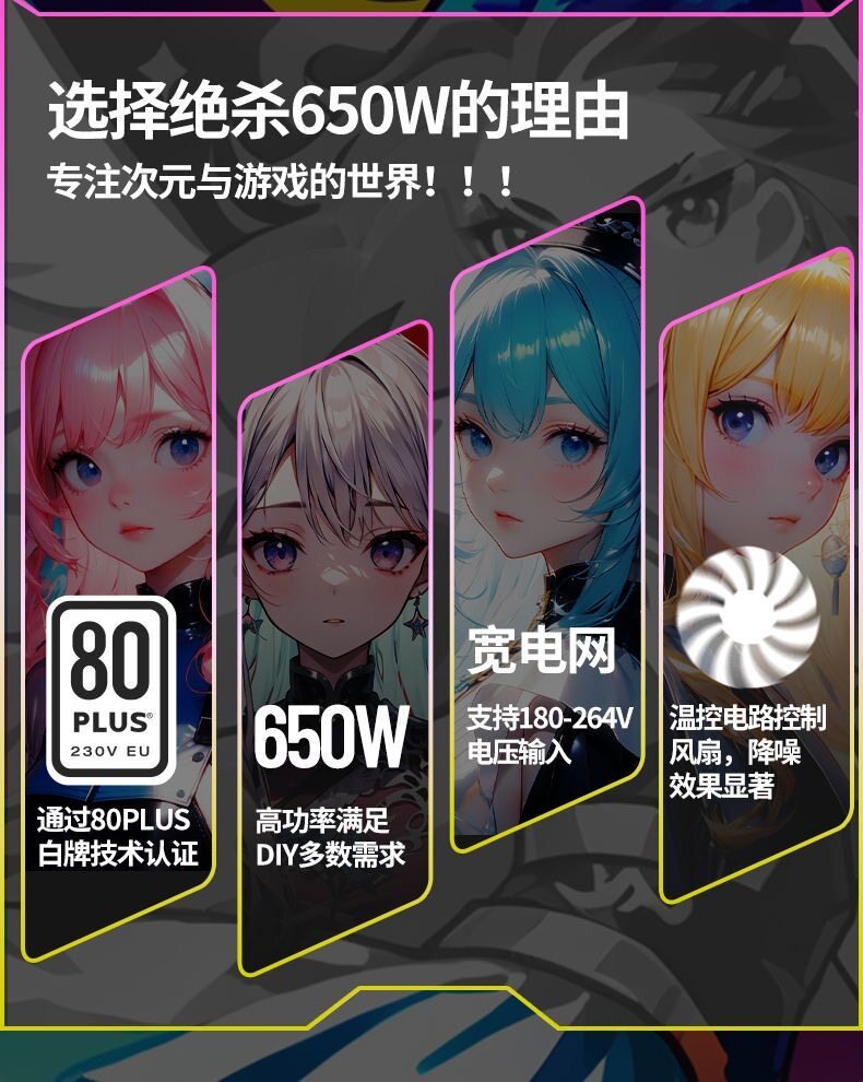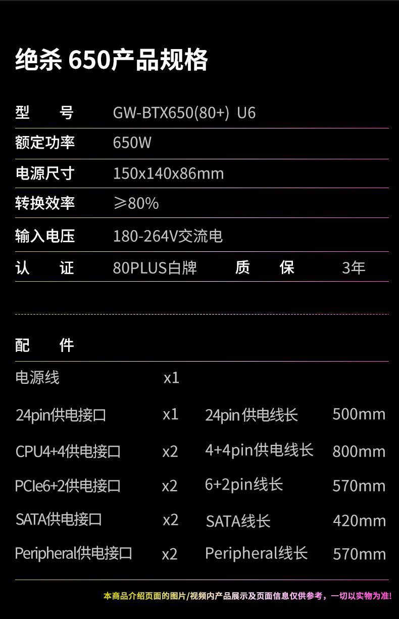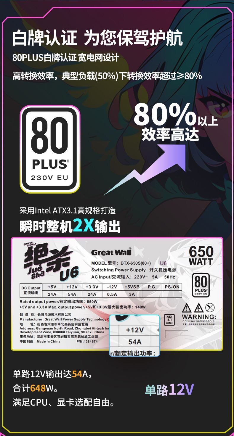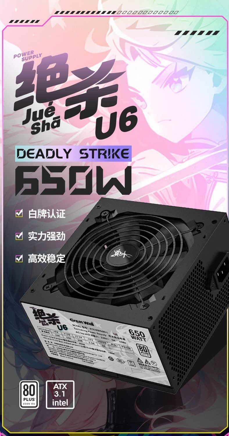 商品名称:长城绝杀 U6 额定650W白牌直出ATX3.1台式机电源 商品编号:ECS020972 品牌:长城 上架时间:2026-03-28 商品毛重:0克