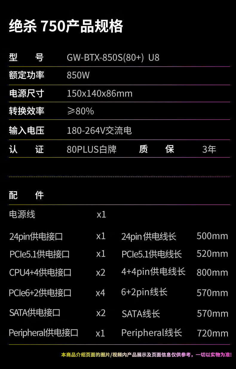 商品名称:长城绝杀 U8 额定850W白牌直出ATX3.1台式机电源 商品编号:ECS020974 品牌:长城 上架时间:2026-03-28 商品毛重:0克