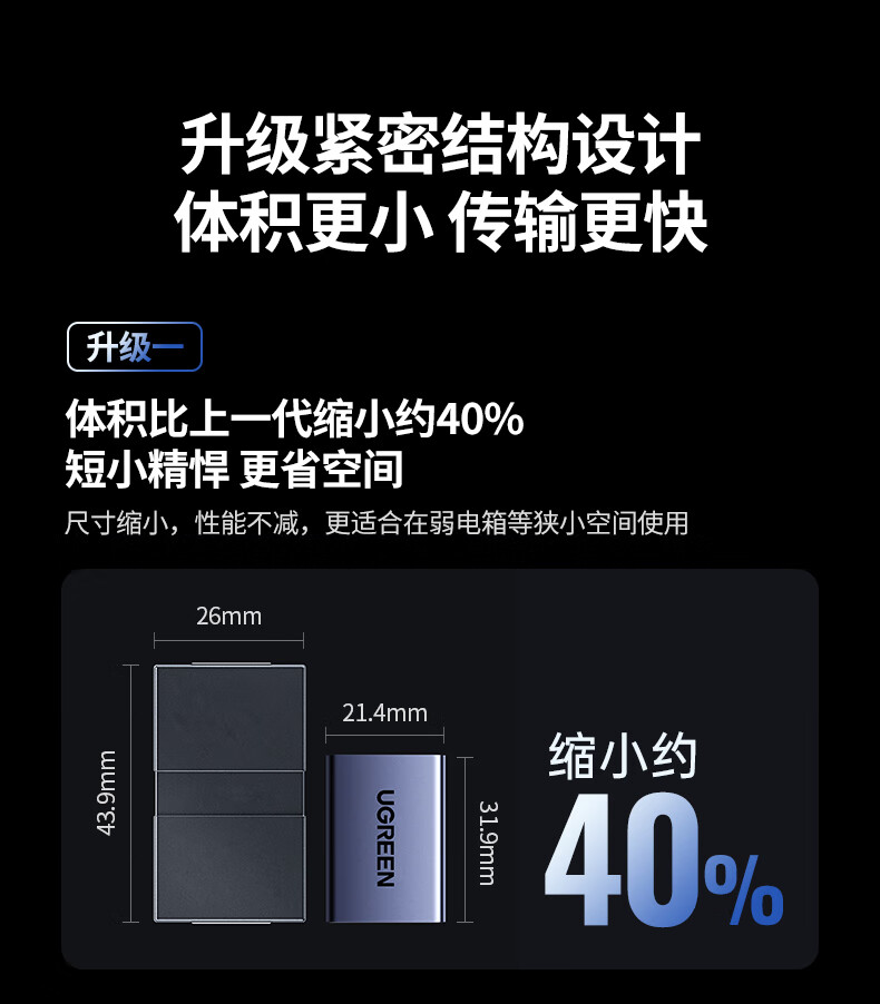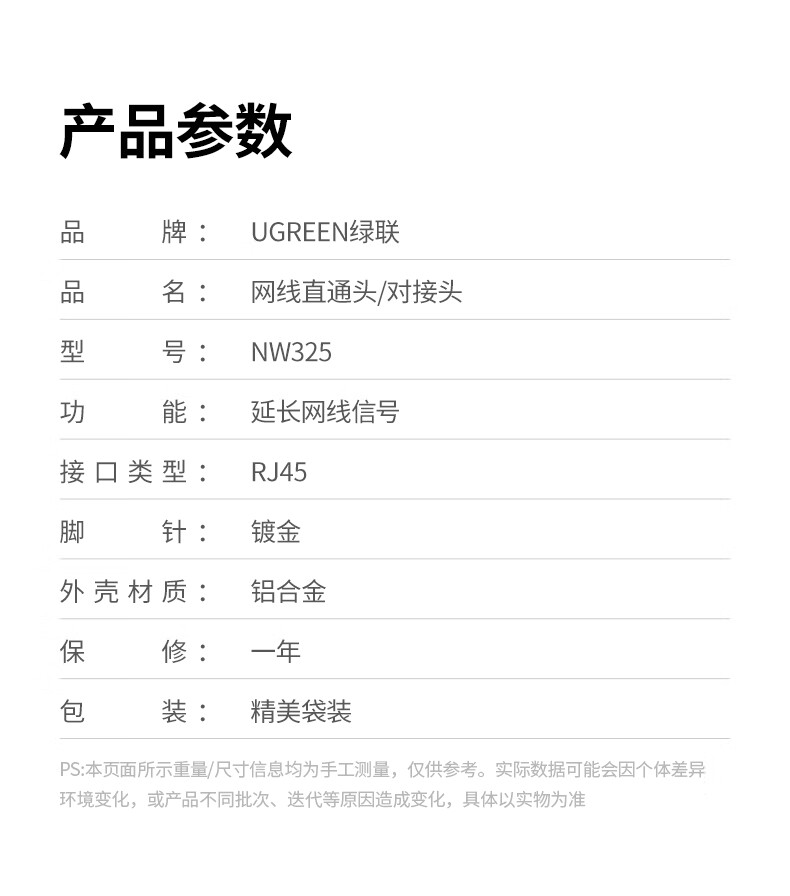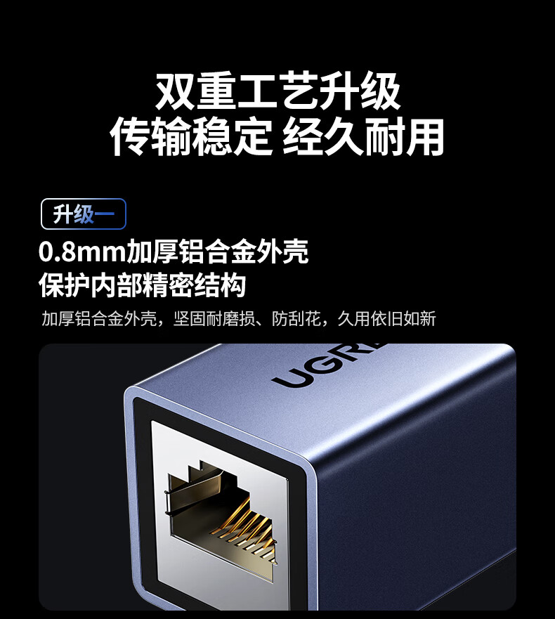 商品名称:绿联55358网络直通头/支持POE供电/网线对接头千兆铝壳屏蔽袋装 商品编号:ECS021005 品牌:绿联 上架时间:2026-03-29 商品毛重:0克