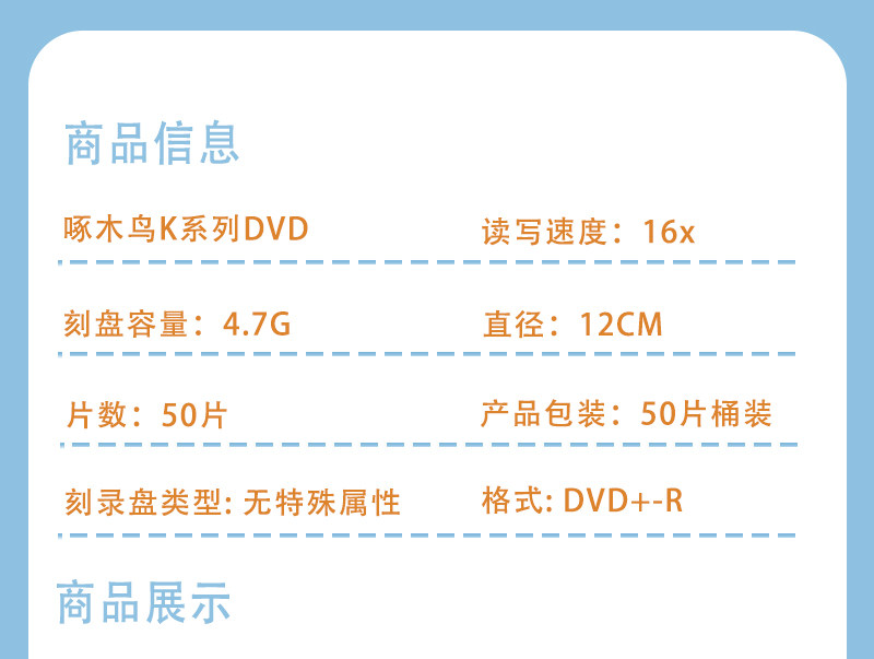 商品名称:1.18元/张 啄木鸟K系列 DVD-R 16X (50片/桶) 商品编号:SR2795 品牌:啄木鸟 上架时间:2015-09-20 商品毛重:0克
