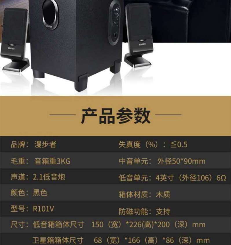 商品名称:Edifier/漫步者 R101V多媒体电脑音箱2.1笔记本小音响木质低 商品编号:ECS008064 品牌:漫步者 上架时间:2018-11-13 商品毛重:0克