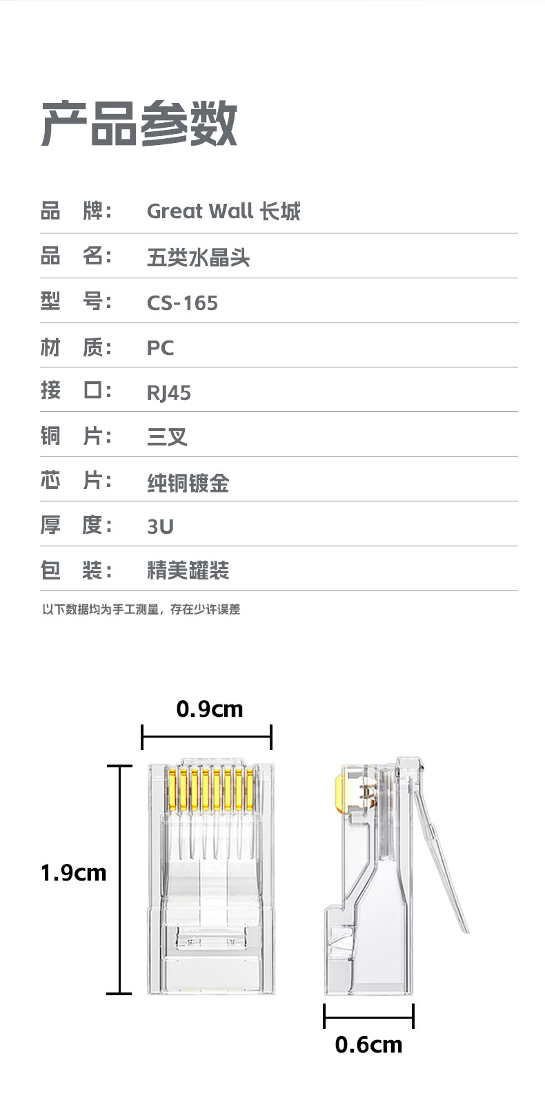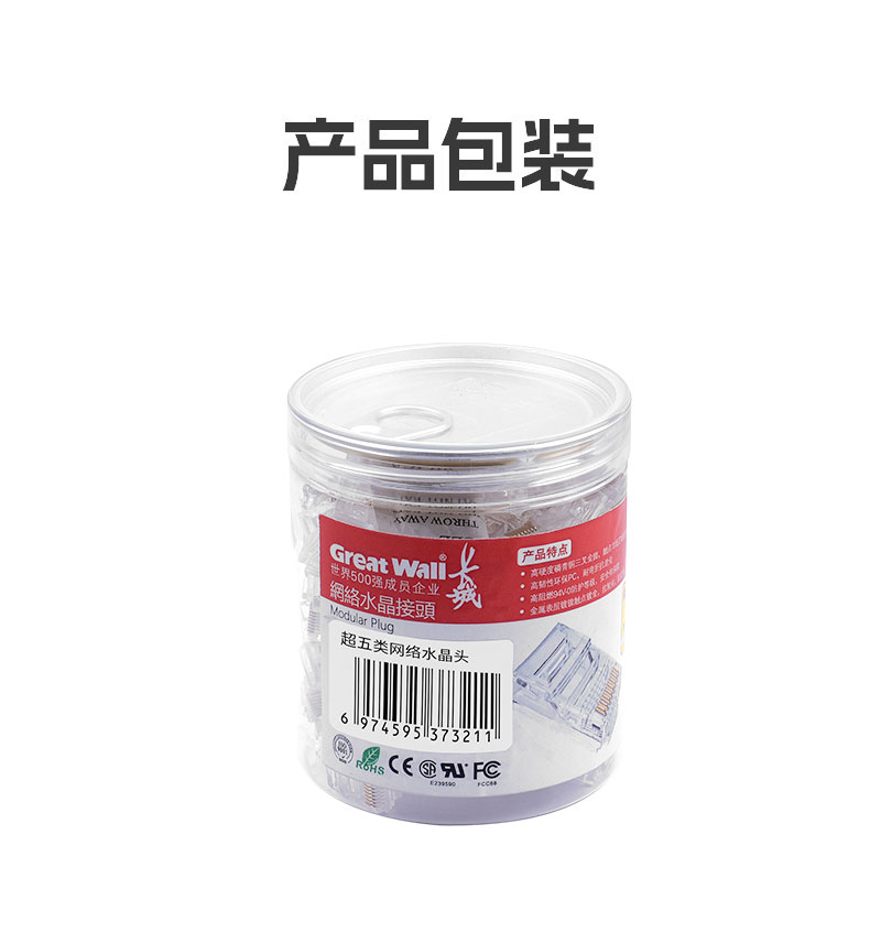 商品名称:长城CS165 102/罐 RJ45(三叉加厚镀金 抛光) 超五类非屏蔽8P8C网络水晶头 商品编号:ECS016776 品牌:长城 上架时间:2022-08-10 商品毛重:0克