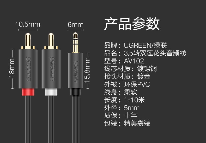 商品名称:绿联60834 1.5米3.5MM转双莲花头音频线 商品编号:ECS018301 品牌:绿联 上架时间:2024-05-28 商品毛重:0克