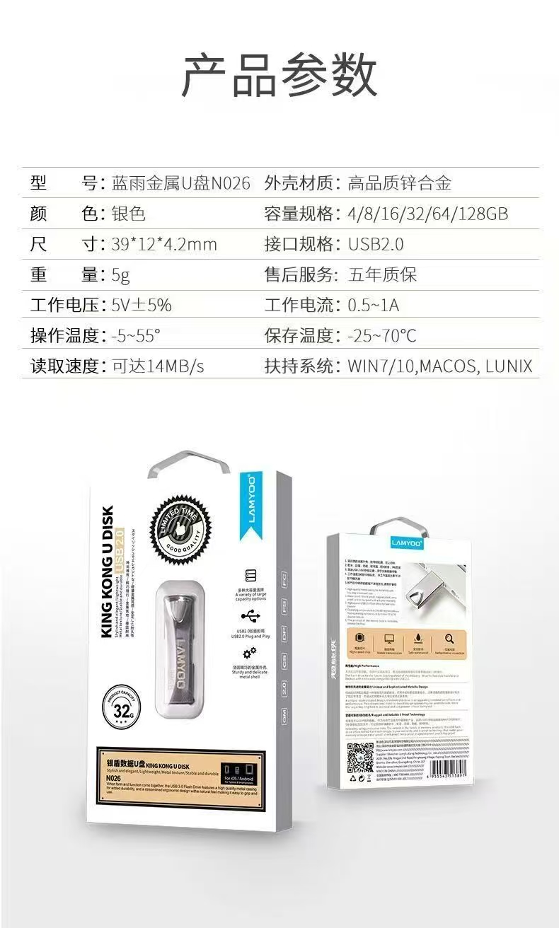 商品名称:蓝雨N026 16G USB2.0金属U盘 商品编号:ECS020109 品牌:蓝雨 上架时间:2025-08-29 商品毛重:0克
