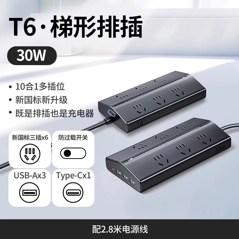 商品名称:绿联 T6 30W 中规 全长3米 梯形插排 商品编号:ECS020159 品牌:绿联 上架时间:2025-08-30 商品毛重:0克