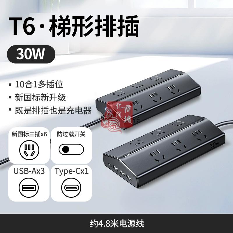 商品名称:绿联 T6 30W 中规 全长5米 梯形插排 商品编号:ECS020160 品牌:绿联 上架时间:2025-08-30 商品毛重:0克