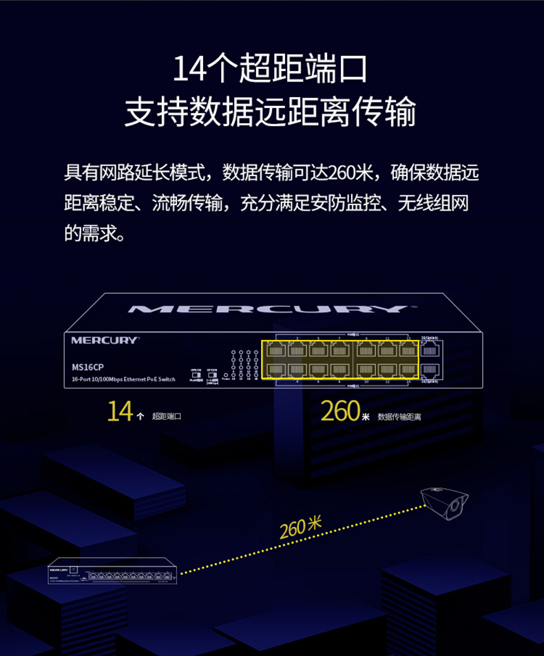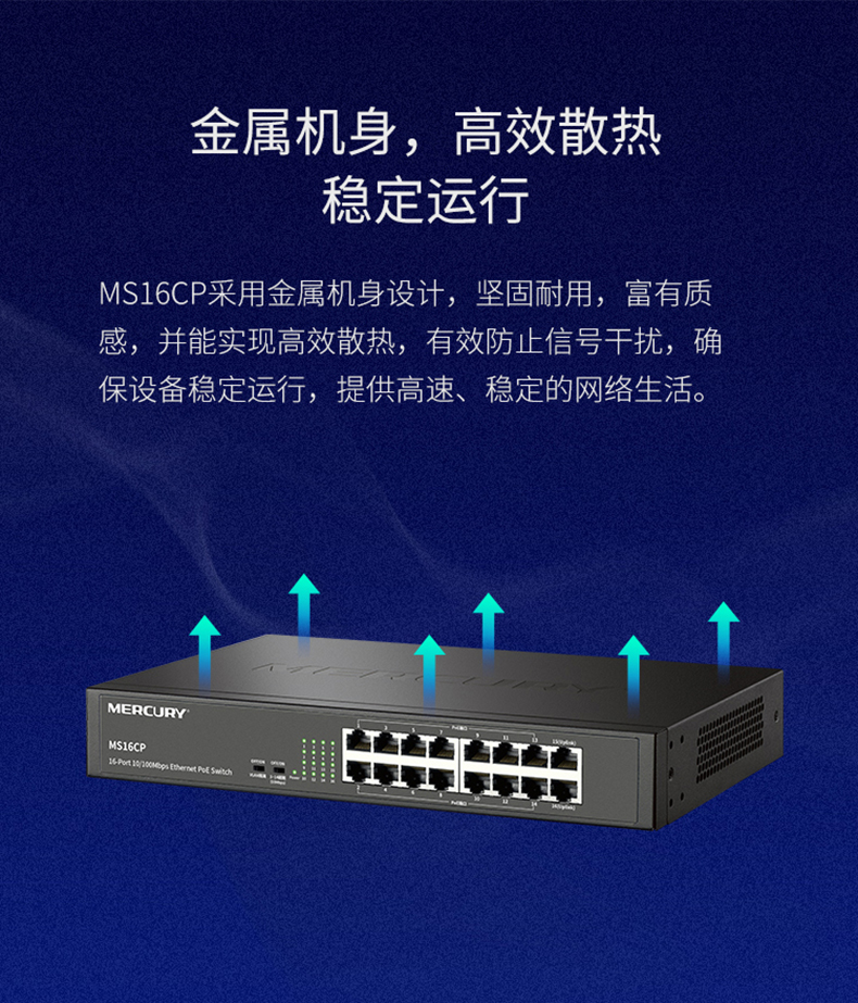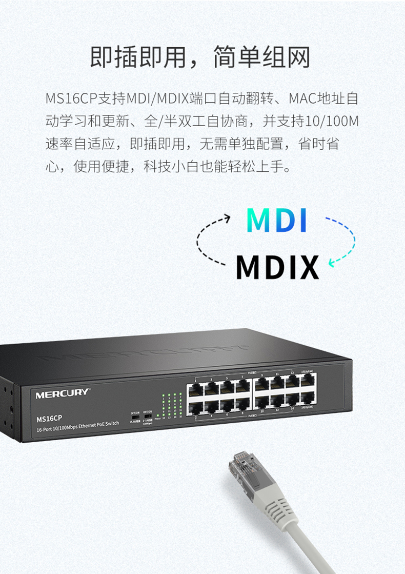 商品名称:水星MS16CP 16口百兆监控专用PoE交换机 商品编号:ECS020318 品牌:水星 上架时间:2025-11-19 商品毛重:0克