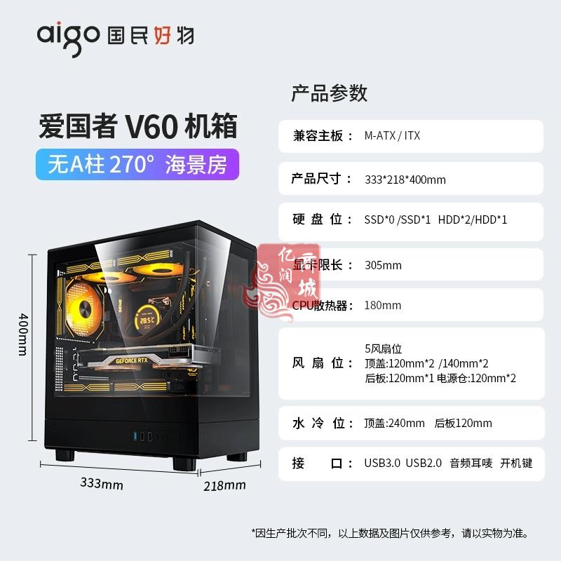 商品名称:爱国者V60 黑色 海景房机箱MATX紧凑型240水冷无立柱机箱 商品编号:ECS020448 品牌:爱国者 上架时间:2025-12-15 商品毛重:0克
